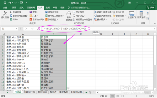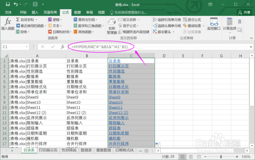 5.在C1输入公式【=HYPERLINK("#'"&B1&"'!A1",B1)】。经由过程这个公式,给目次表建立超链接。
