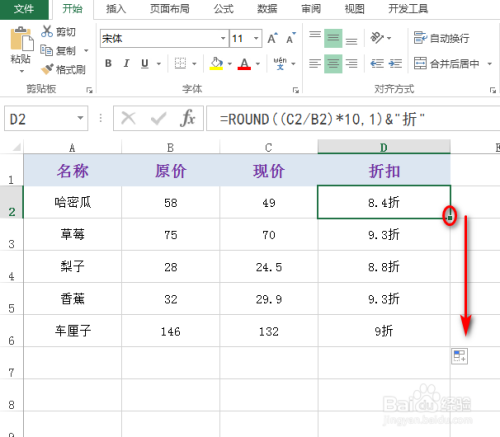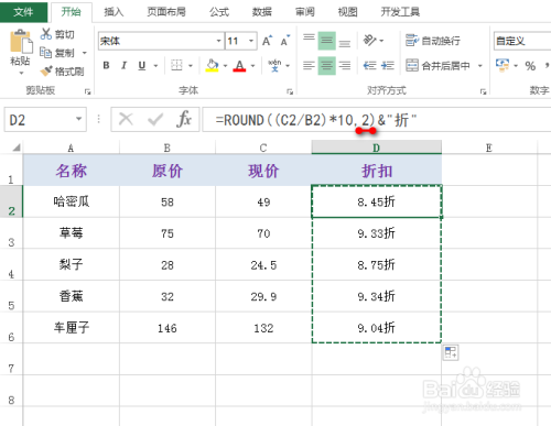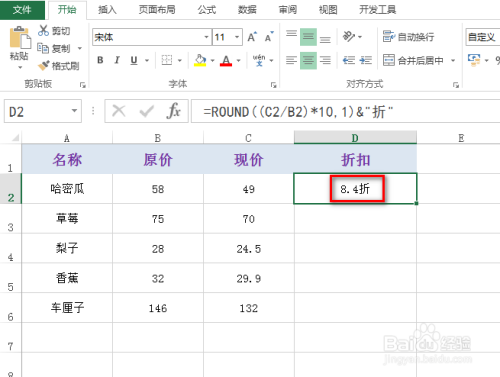 首先选中一个单位格,然后输入公式:=ROUND((C2/B2)*10,1)&"折",具体如下图所示: