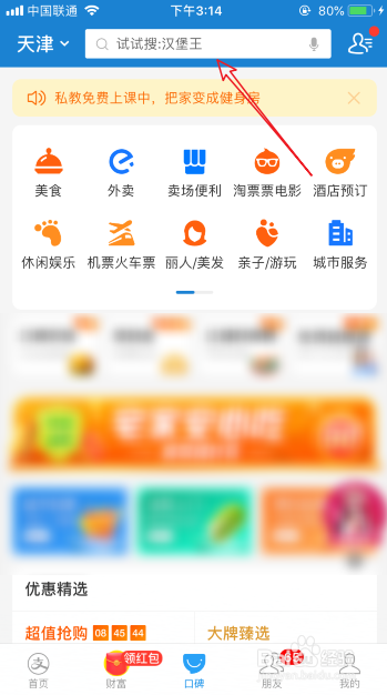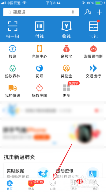首先,我们打开支付宝首页,然后点击页面下方的【口碑】,如图所示