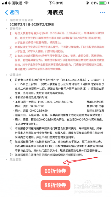 这样我们就进入在校大学生领券页面了,下图申明了69折与88折券的利用时段,大师需方法取的打折券与就餐时段一致,我们点击下方的【赞成法则并领券】