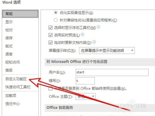 3、接着在打开的word2019选项窗口中,点击自界说功能区的菜单项。