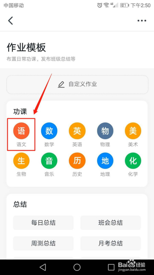 在“功课模板”界面,选择安插功课的科目,本例中选择“语文”。也可以“自界说功课”。