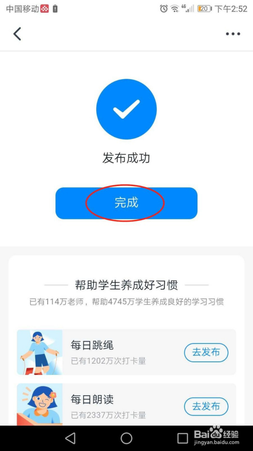 班级群中功课安插完当作,发布当作功。点击页面中的“完当作”按钮即可。