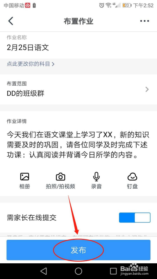 在“安插功课”界面,输入“功课名称”,设置“安插规模”,编纂“功课详情”,按照需要点击“需家长在线提交”开关按钮,然后点击“发布”按钮。