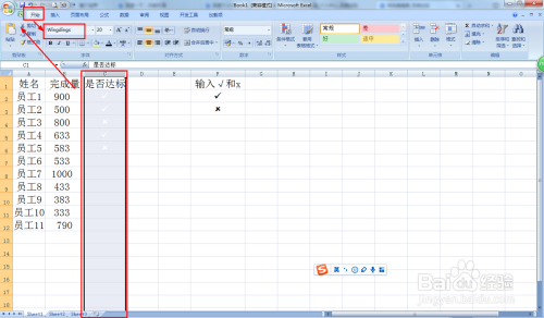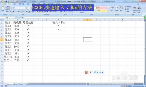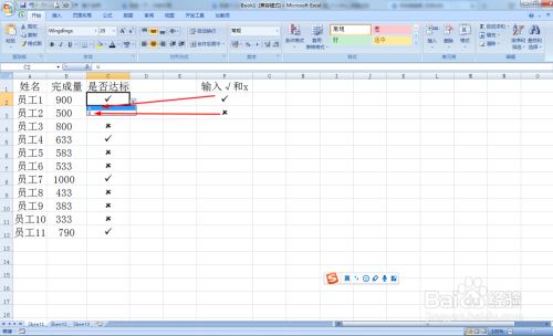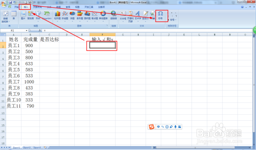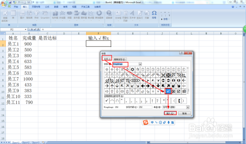 点击符号——字体选择:Wingdings——标的目的下拖动滑块——找到√符号选择并点击插入。这里有带方框和不带方框的勾。同样方式在F3单位格输入x。