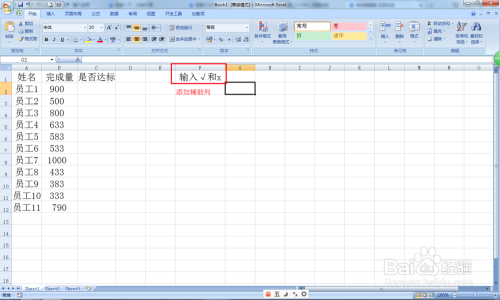 首先在空白那边添加辅助列,在F1单位格那边定名为:输入√和x——按下回车键。