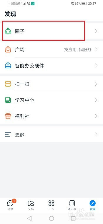 第一步在我们的手机上打开钉钉,进去发现页,点击圈子,如下图所示: