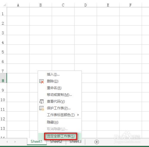 选中第一个工作表,鼠标右键,在呈现的下拉菜单中,选择“选定全数工作表”,具体如下图所示: