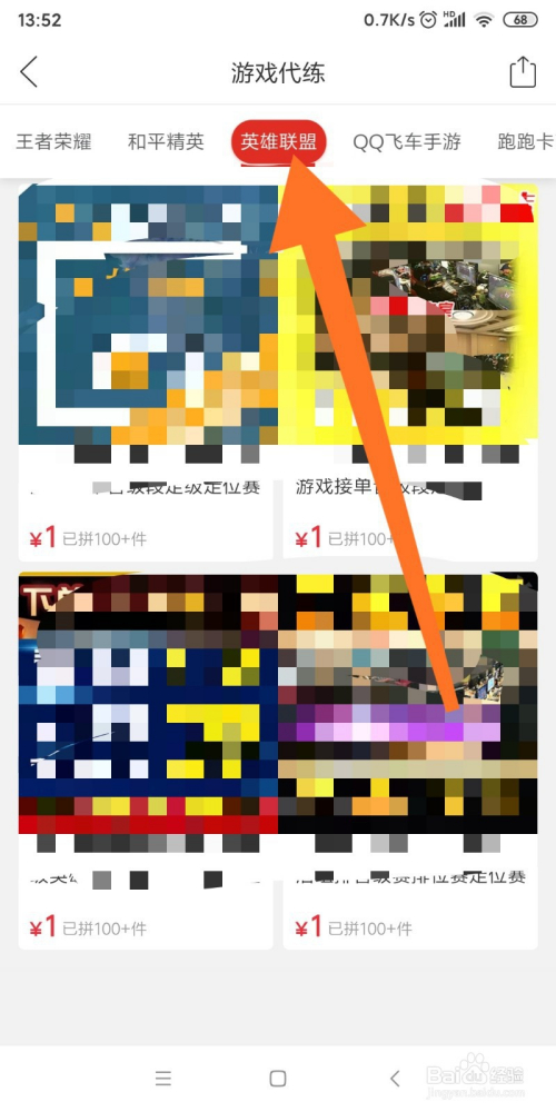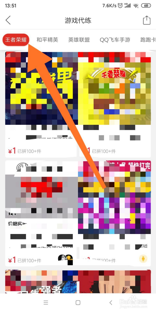 4.如图所示,我们看到在这个游戏代练的界面中,箭头所指的这个页面里都是王者荣耀的代练商品。