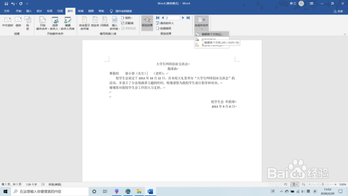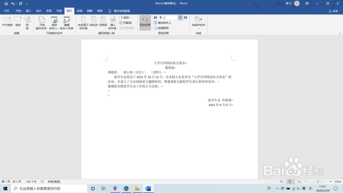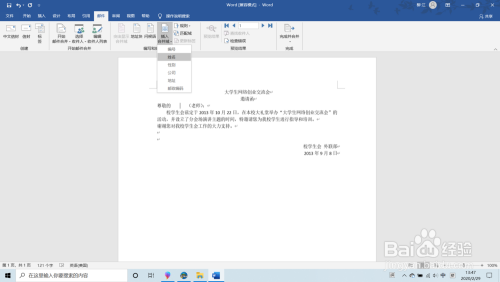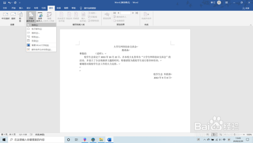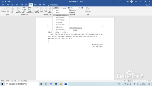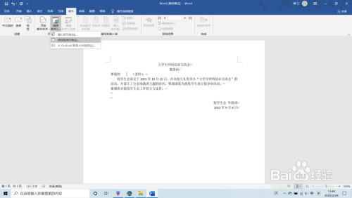 打开要归并的文件,将鼠标放于要归并的位置,如文中“尊敬的”和“教员”之间,并点击"邮件"按钮。