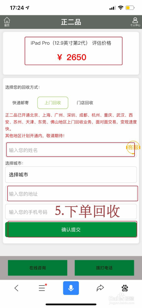 5.选择收受接管体例:平台供给了上门收受接管、邮寄收受接管、门店收受接管体例,按照本身的便利进行选择,提交订单后,将收到一条平台提醒短信,意味着下单当作功。