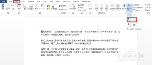首先选中要设置的文字,在“插入”选项卡下找到并点击“首字下沉”下的小三角,在呈现的下拉菜单中,点击“下沉”,具体如下图所示: