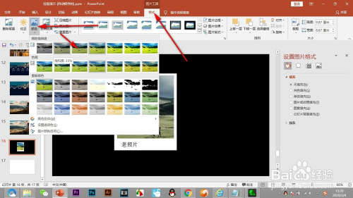 6.点击图片,然后在格局——颜色,颜色的饱和度选择一个比力低的,点击。