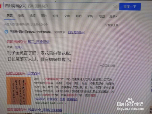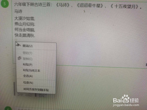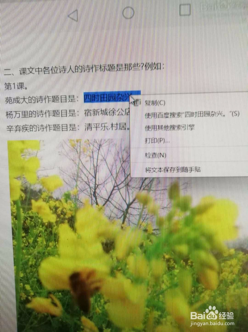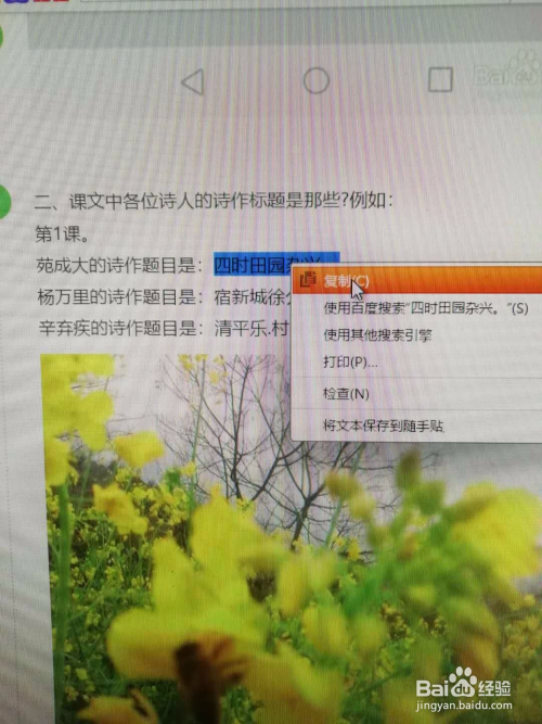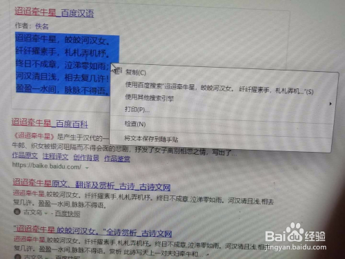 在百度显示的资猜中,选中古诗《田园杂兴》或者《迢迢牵牛星》内容并右击鼠标后左击复制。《迢迢牵牛星》内容可以利用以上法子搜刮获得。