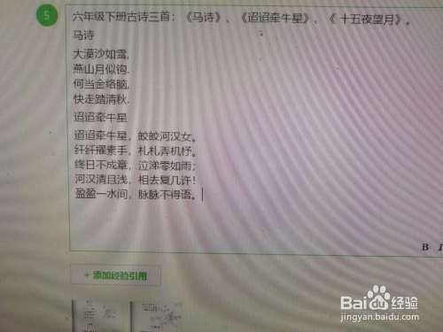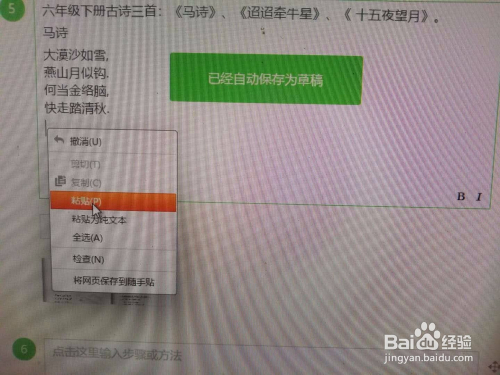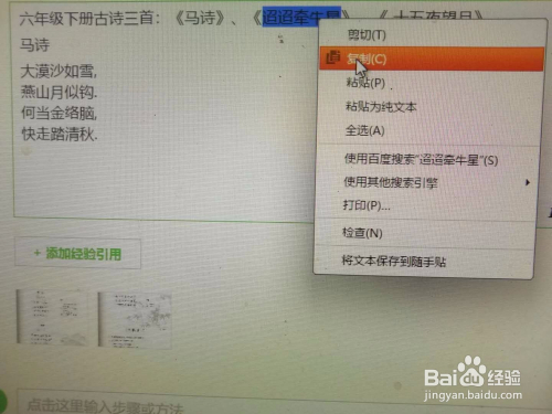 点击“粘贴”,古诗复制在了要复制的处所。例如下图,《迢迢牵牛星》的内容复制到了百度经验写作之处。