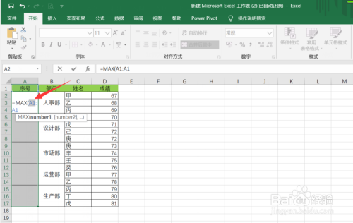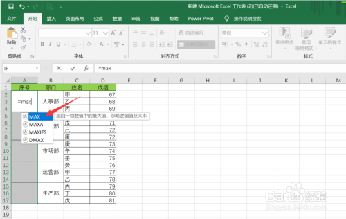 1:打开表格,框选要填充序号的单位格,输入 =max ,双击电脑弹出来的提醒MAX
