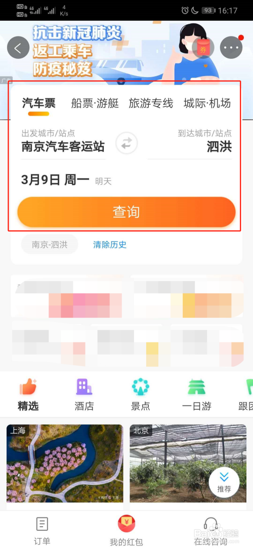 3、之后输入出发城市、达到城市和时候,点击查询;