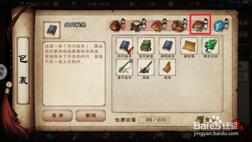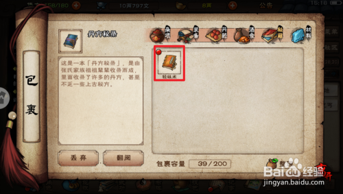 2.点击底部的【武功】,再点击【秘笈】,在秘笈里面找到这本【轻纵术】。