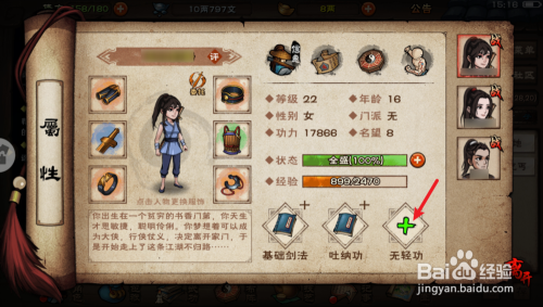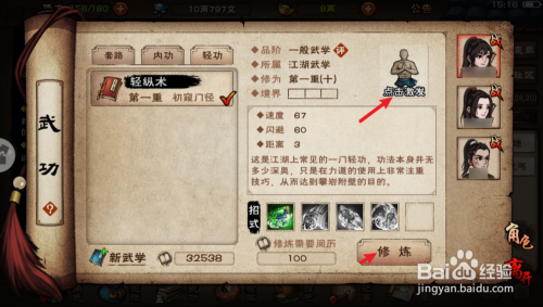 3.点击脚色学会轻功,然后再加到本身的武功列内外,在轻功档点击+号,