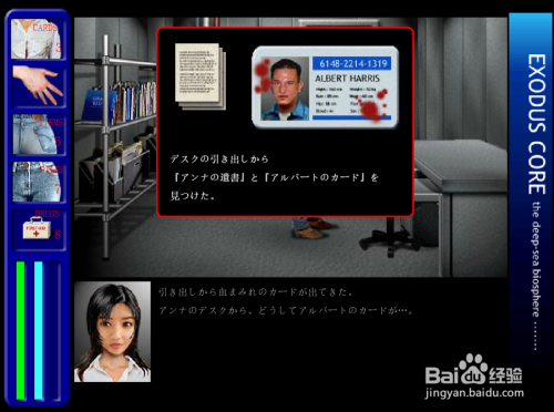 出来,去B栋下梯口舱门边上的一字型走廊,第一个房间是茅厕,进步前辈第二个房间,书架上多是动物学的书,在桌子抽屉里发现安娜的遗书和一张沾血的小我信息卡,卡上写着“艾伯特·哈里斯”,房间里面的地上还能拿到药箱。(药箱携带上限为9份)