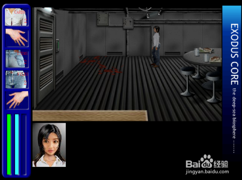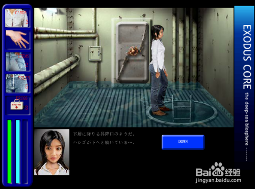 厨房里没有什么工具可以拿,但若是您如果打开了左边的冰箱门,里面会窜出触手来进犯您,您身上并没有兵器,厨房的刀具因为没有庇护刀尖的工具而不让拿,所以什么都不要动,从厨房直接出去。再往下直走打开舱门,见到一个下梯口,下去到基层。