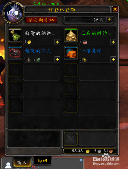 跑到他面前,用鼠标右键点击他,他就会停下来。他出售的第一个物品就是“粘滑的纳迦眼球”,可以用金币直接采办。