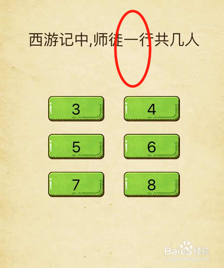 这一关需要我们领会西纪行中师徒几人的特点,之后我们会发现此中只有唐僧是人,其他的都不是真正的人,所以准确谜底是“1”,可是页面下方没有这个选项,准确的做法是点击题干中的“一”即可。
