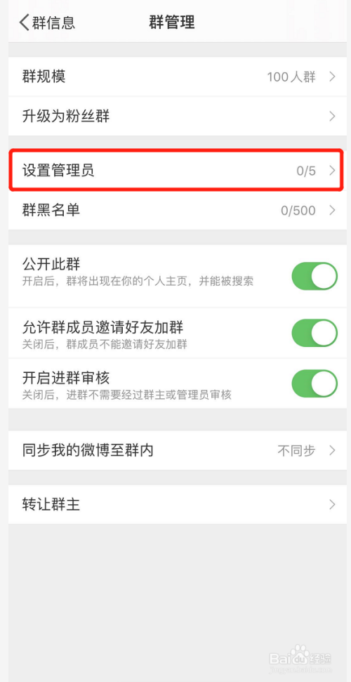 进入群办理本家儿页后,找到设置办理员一栏,点进去!