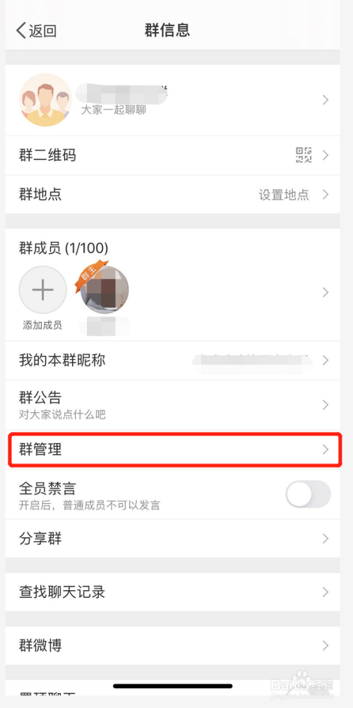 在群信息本家儿页下找到如下图的群办理一栏,点击群办理!