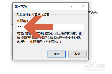 接下来就会弹出加密文档对话框,在输入框中将文档的密码设置好,点击确定密码庇护即生效;
