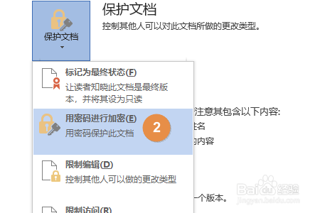 我们需要点击庇护文档左侧图标下方的三角形下拉按钮,见图一...然后就能看到“用密码进行加密”了;