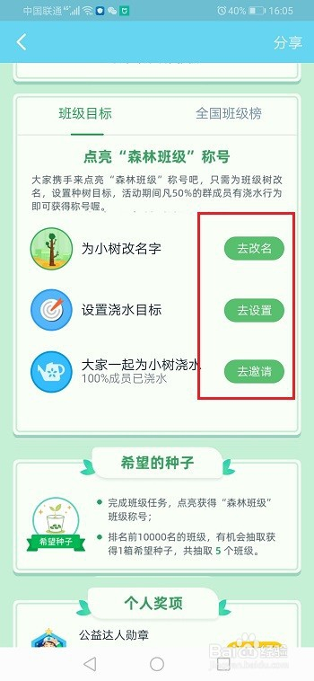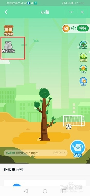 第三步在丛林班级界面,可以看到需要给班级树更名,设置方针,50%以上的人浇水,就可以获得丛林班级称号,如下图所示: