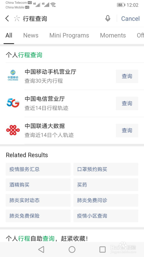 打开微信,在搜索框输入关头字“小我行程助手”或者“行程助手”,如下图: