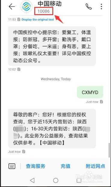 中国移动:短信编纂代码“CXMYD”至10086,会收到授权提醒,按照提醒输入查询手机号入网身份证后4位便可收到近期一月的到访地,如下图:
