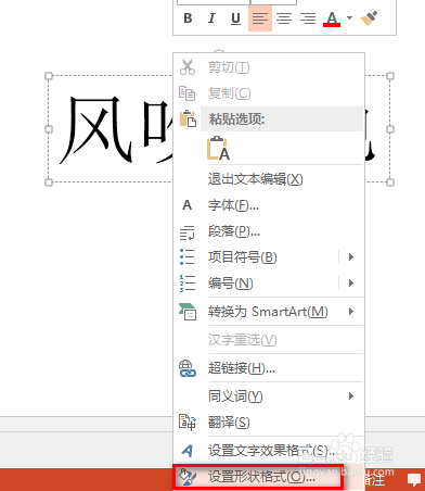 然后选中该字体内容,鼠标右键,在呈现的下拉菜单中,点击“设置外形格局”,具体如图所示: