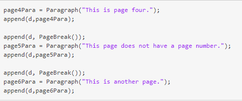 建立一个PageNumber对象以指定页码从4起头,并利用大写的罗马数字。将对象添加到文档的当前页面结构。