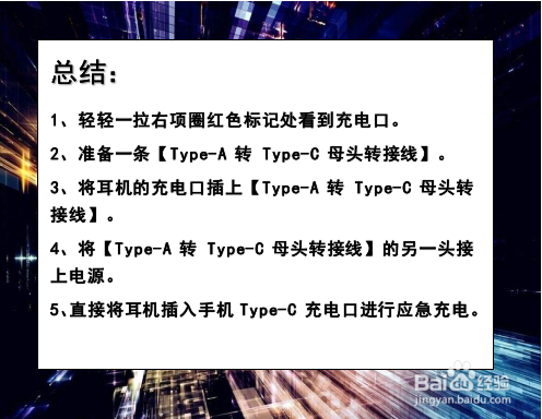 5、直接将耳机插入手机Type-C 充电口进行应急充电。