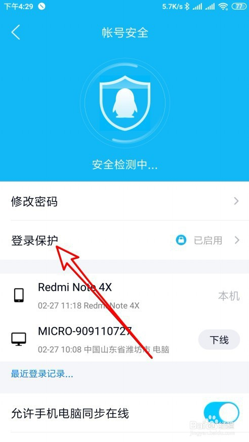 在打开的账号平安的页面中点击登录庇护的设置项。