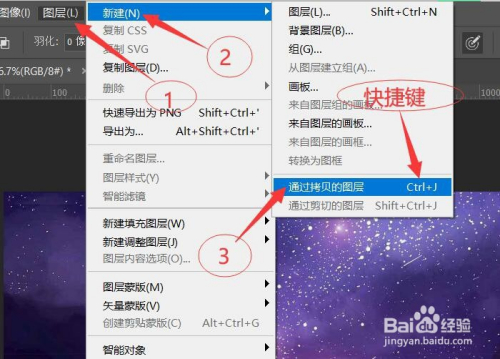 然后执行【图层】→【新建】→【经由过程拷贝的图层】,或者利用快捷键【Ctrl+J】将【布景】图层复制一层,如图