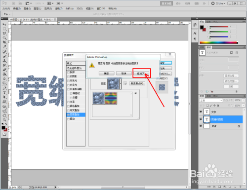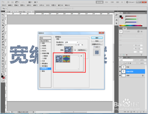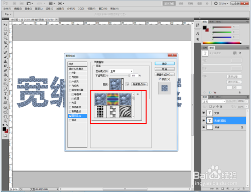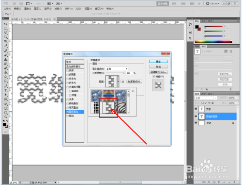 双击图示文字图层,弹出图层样式设置栏。勾选【图案叠加】,点击图示小三角,弹出图案选项栏;