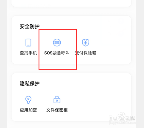 第三:点击【平安防护】里的【SOS告急呼叫】选项。