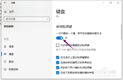 5、将利用粘滞键的滑动按钮标的目的右滑动。