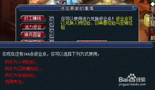 点击兑换求学点之后会呈现三个选项,别离是转化所有活力、转化500活力以及转化100活力,可以按照本身的需要进行选择,若是没有烹调炼药等耗损活力的糊口技术,也不是大唐鬼门关可以做神兵灵宝,技术又低卖不出符去,建议活力都处置在这里吧,省心。