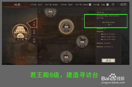 囤积资本,点击进入城建,将君王殿进级到八级,建造寻访台。