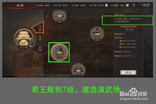 囤积资本,点击进入城建,将君王殿进级到七级,建造演武场。