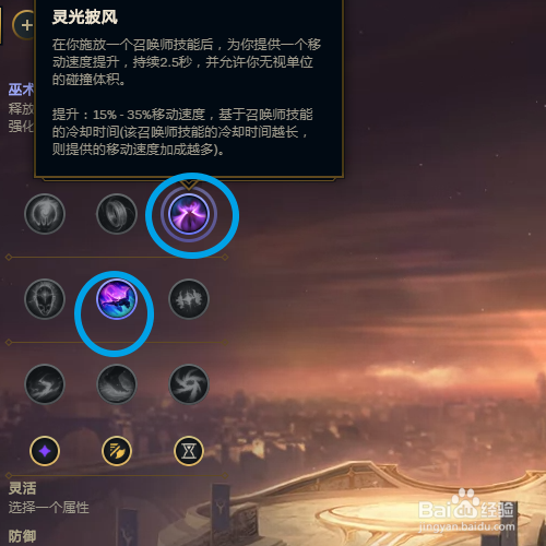 盖伦的副系的话就比力见仁见智了,小我此刻比力喜好带巫术系。点出灵光披风先天,这个先天的加快结果提高了追击和逃跑当作功率。点出迅捷先天提高移动速度。