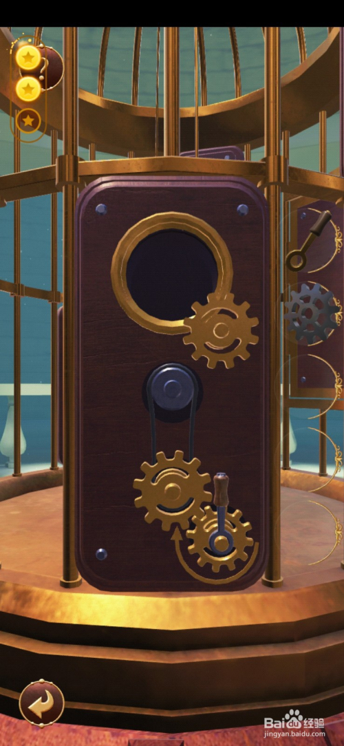 回到最初的画面,把两个齿轮和把手,皮带安上去,动弹把手,打开锁孔。
