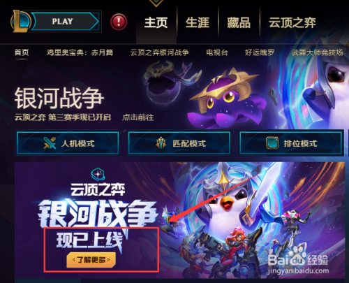 第一:打开英雄联盟客户端点击首页【银河战争】领会详情。