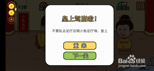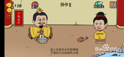 第2关,把水池里的鱼放到皇上的脚盆中,最后放一条食人鱼,过关。