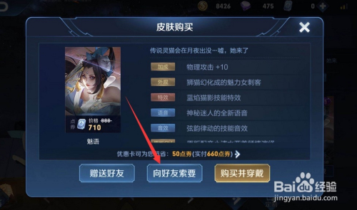 最后,在弹出的对话框中我们可以选择本身采办或者标的目的老友索取,即可获得魅语皮肤。